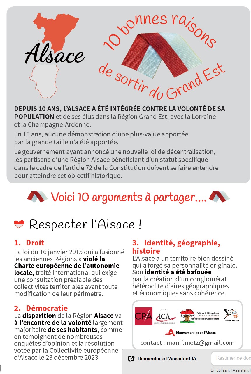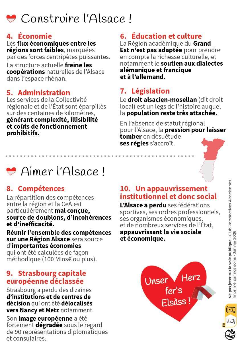 Nous plaidons pour une organisation territoriale reposant sur les réalités historiques et culturelles, attentive aux spécificités locales et au respect des identités régionales. À nos yeux, l’Alsace pourrait ouvrir la voie et servir de terrain d’expérimentation à cette évolution. Voici nos propositions : Pour une décentralisation complète et radicale (pdf)